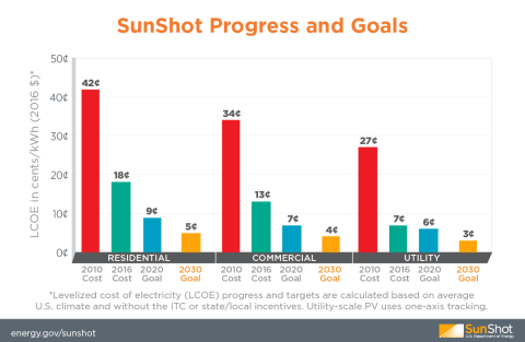 The Energy Department's SunShot Initiative was launched in 2011 with the goal of making solar electricity cost-competitive with traditional energy sources without subsidies by 2020. In just five years the SunShot Initiative and the U.S. solar industry have achieved more than 90% of the established 2020 goal to reduce the cost of utility-scale solar PV electricity to $0.06 per kilowatt-hour. Utility-scale solar electricity costs now average $0.07 per kilowatt-hour. The new SunShot 2030 targets are $0.03 per kilowatt-hour for utility-scale PV, $0.04 per kilowatt-hour for commercial PV, and $0.05 per kilowatt-hour for residential PV. These targets are for areas with average U.S. climate and without subsidies. In the sunnier regions of the country, achieving the SunShot 2030 targets would mean costs of $0.02 per kilowatt-hour for utility-scale solar.