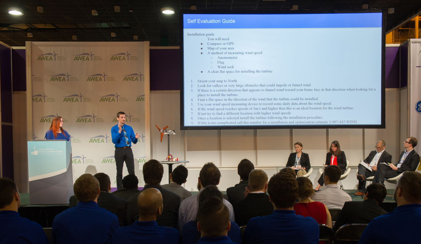 The Collegiate Wind Competition consists of four main contests: Business Plan, Technical Design, Siting Knowledge, and Turbine Testing. Tasks include written reports, oral presentations, testing model turbines in a wind tunnel, and a public business pitch before a panel of wind industry experts. Teams can earn up to 1,000 combined points, and the team with the highest point total will be crowned Collegiate Wind Competition champions. There are also awards for teams that score the highest in each contest, win the bonus competition, or are picked as the overall “People’s Choice” winner based on text voting at the event.