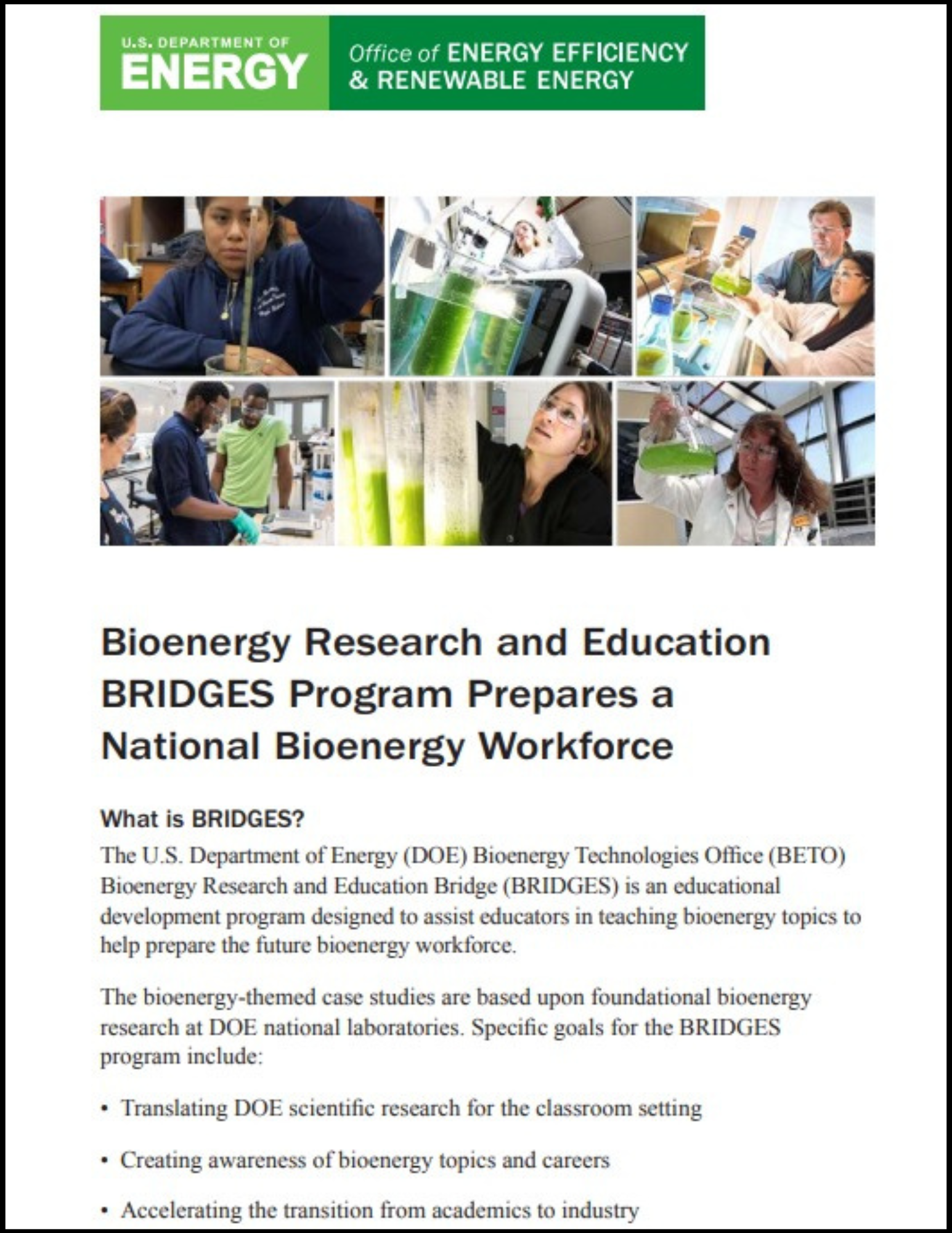 The U.S. Department of Energy Bioenergy Technologies Office (BETO) Bioenergy Research and Education Bridge (BRIDGES) is an educational development program designed to assist educators in teaching bioenergy topics to help prepare the future bioenergy workforce. This is a primer on the program.