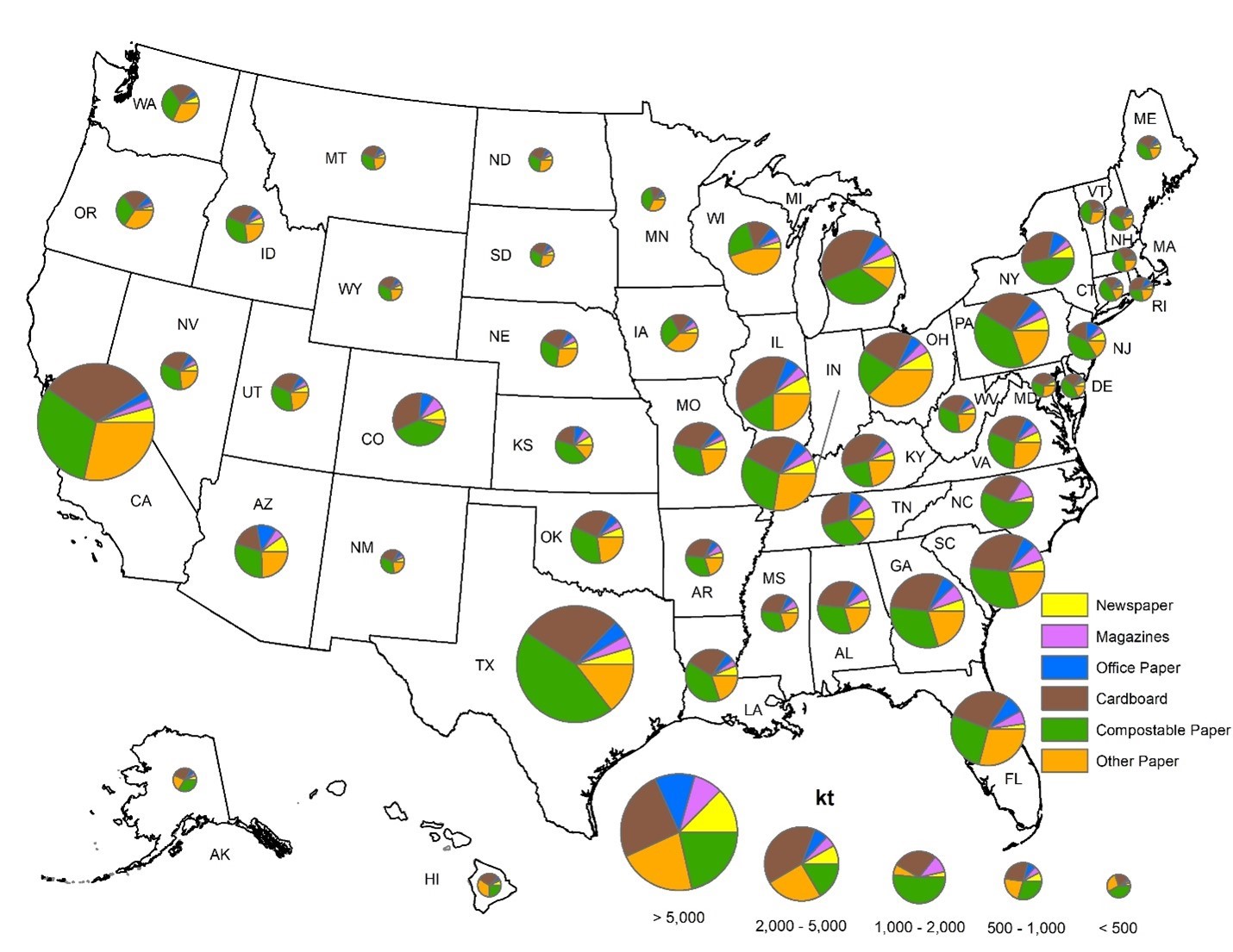 Paper and cardboard waste landfilled in 2019 by type and state. The pie charts’ sizes represent the quantity of landfilled material in kilotons The material types are shown as a percentage of total landfilled material in different colors. Figure by NREL.