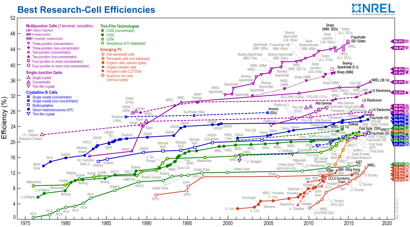 The PV team maintains U.S. leadership in PV R&D, with a strong record of impact over the past several decades. For example, over one half of the world’s PV cell efficiency records on the National Renewable Energy Laboratory’s chart were supported by the PV program and its predecessors.