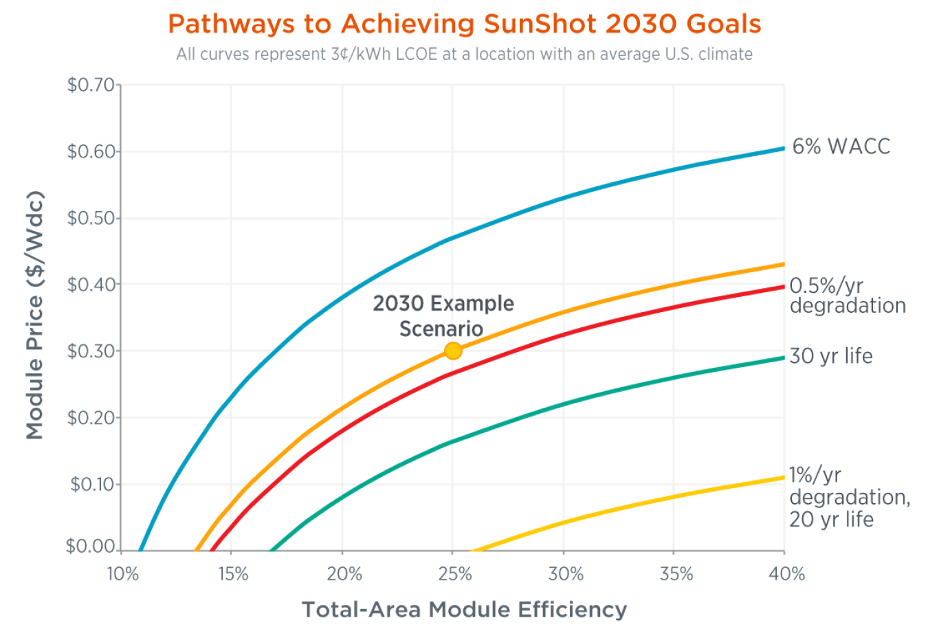 The figure below illustrates different technology pathways to reaching the 2030 goal of $0.03/kWh for subsidy-free utility-scale solar power.