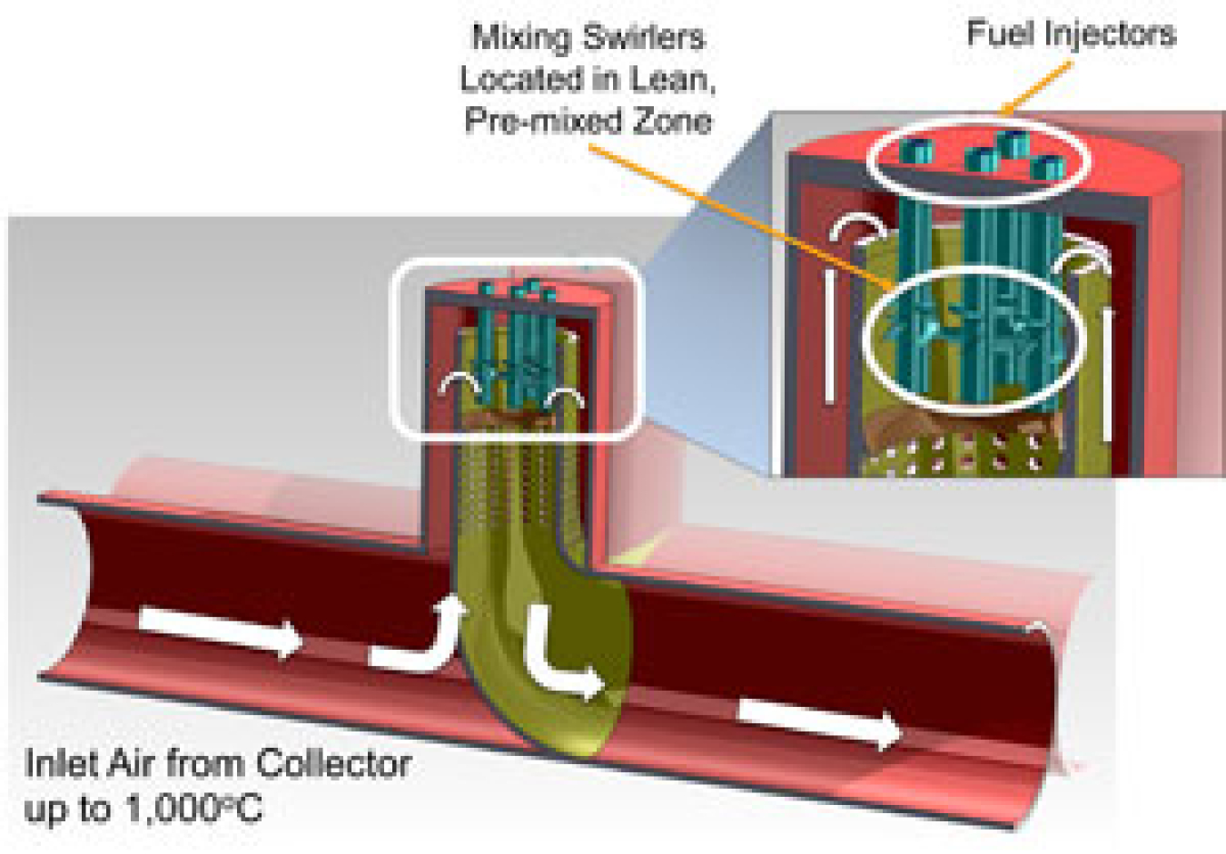 Conceptual combustor design that is optimized for inlet temperature range from 300°C (572°F) to 1,000°C (1,832°F) and low emissions.