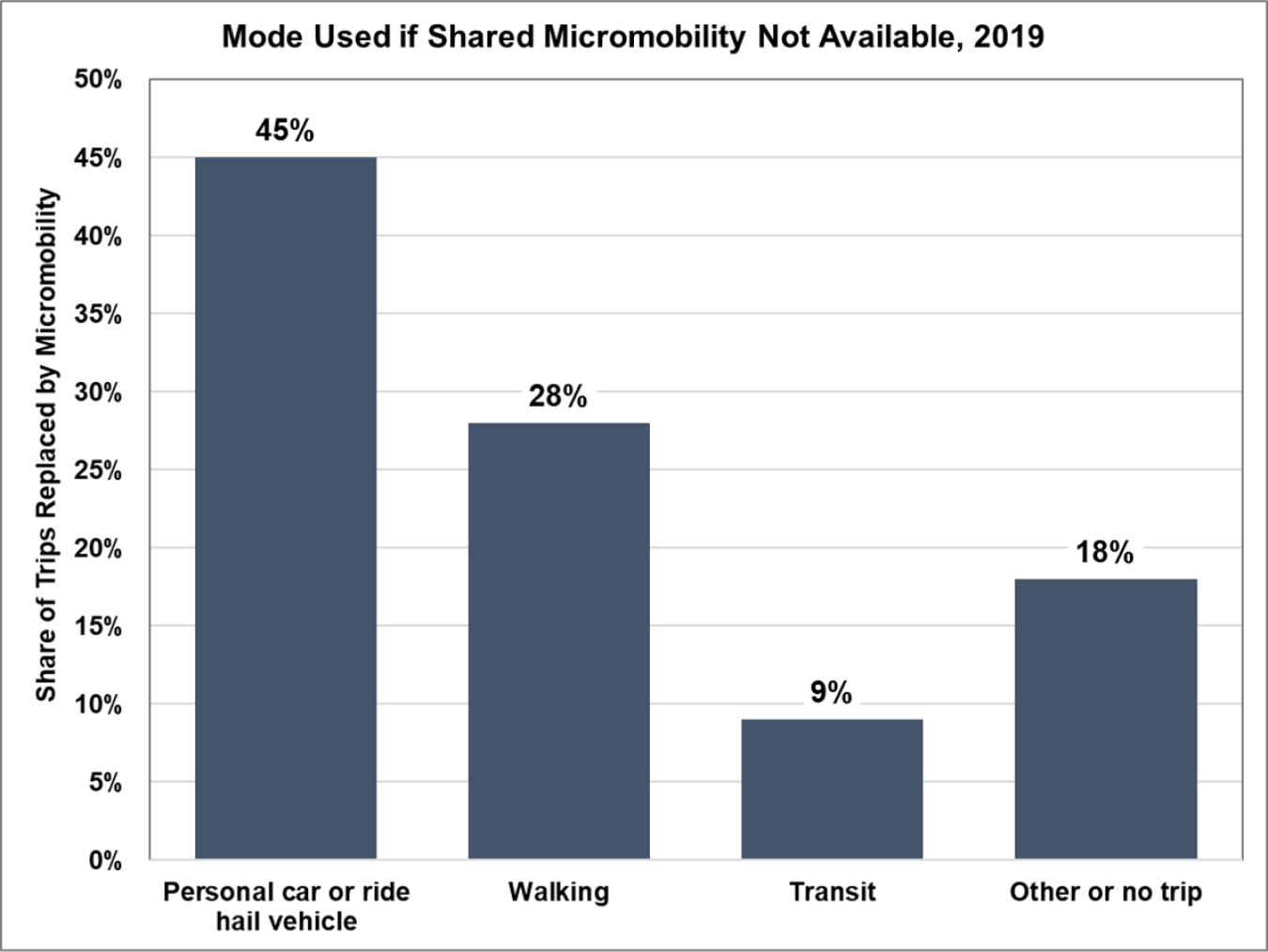 In a 2019 survey, 45% of those using shared micromobility said that they would have used a personal vehicle if the bike/shooter was not available.