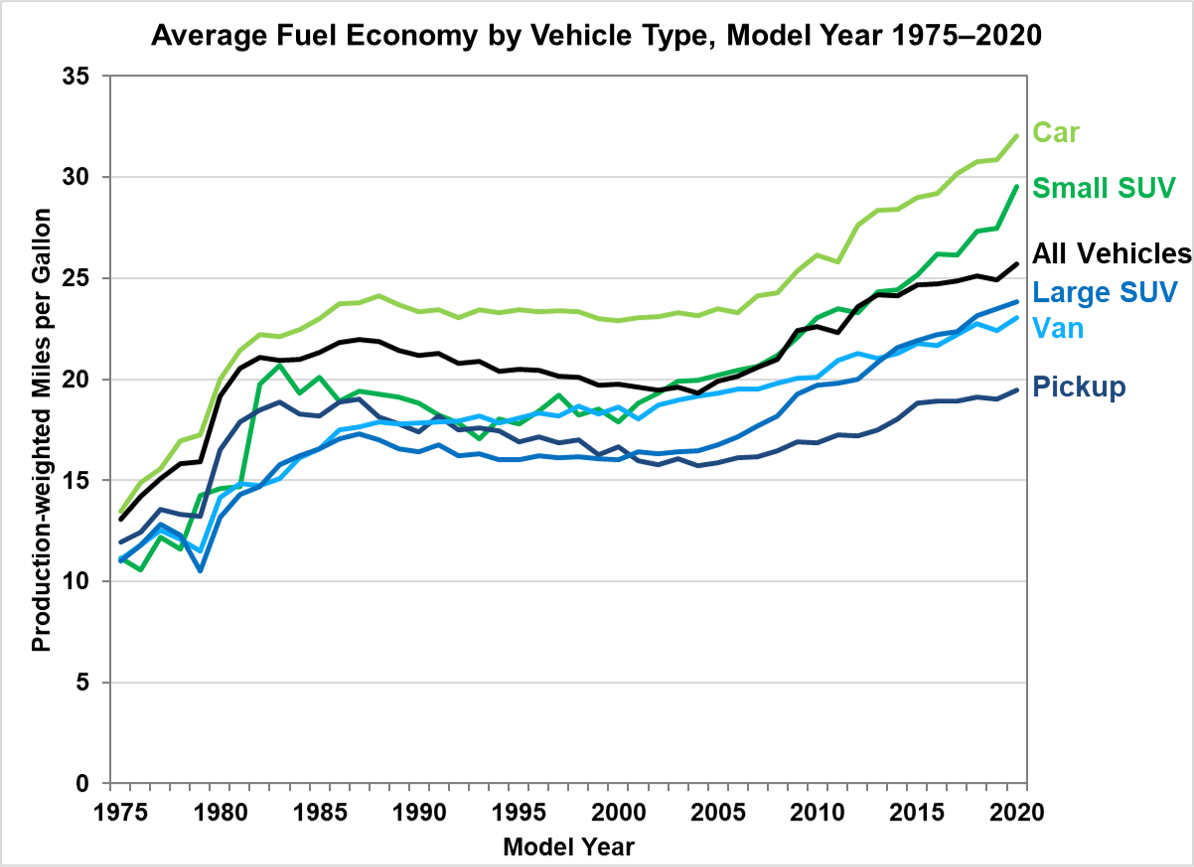 The 2020 EPA Automotive Trends Report shows the production-weighted fuel economy for new light-duty vehicles from 1975 to 2020.