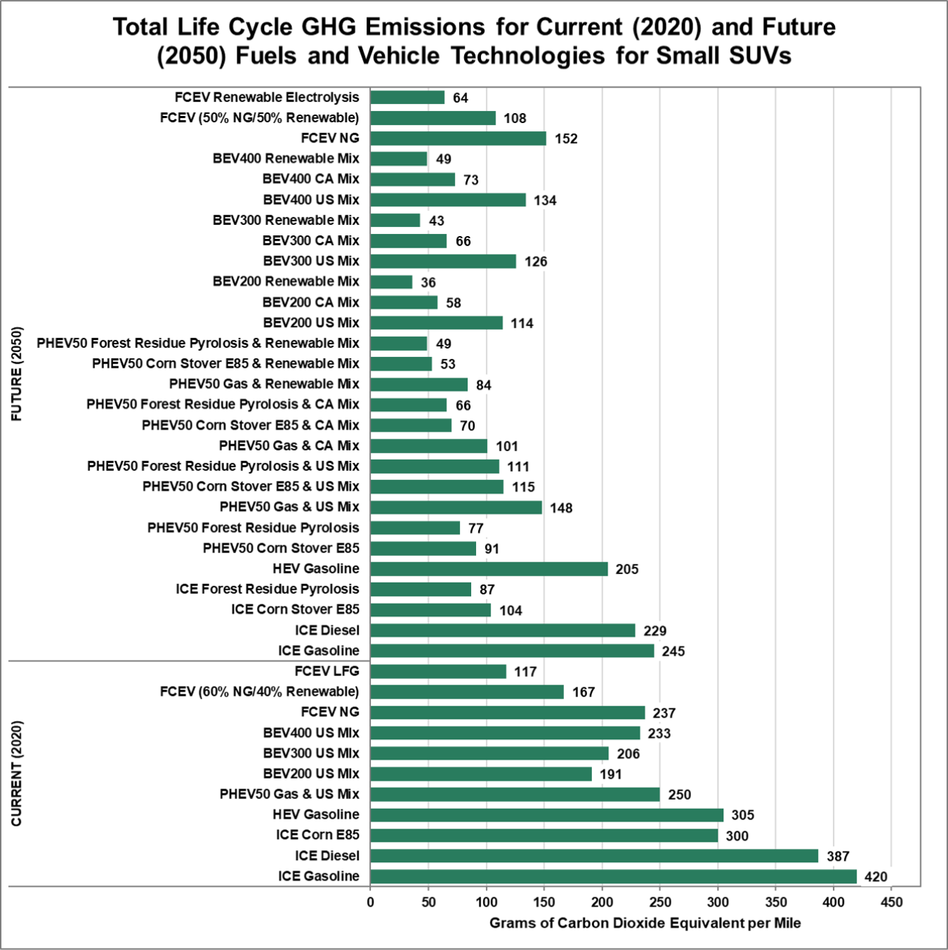 October 18, 2021A 2020 conventional gasoline small sport utility vehicle (SUV) emitted an average of 420 grams of greenhouse gas (GHG) carbon dioxide equivalents per mile (g CO2e/mi) when considering the entire life cycle of the vehicle, from cradle-to-grave and well-to-wheels. A 2020 battery-electric vehicle with 300 miles of real-world range (BEV300) using the average U.S. grid mix emitted about half of that—206 g CO2e/mi. Estimates for future vehicle and fuel combinations show even lower life cycle emissions when compared to their current counterparts. A 2050 BEV300 using a renewable electricity mix is estimated to emit 43 g CO2e/mi.