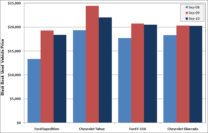 The collapse of new vehicle sales in 2008 has led to lower sales volumes of new vehicles. Also, consumers and business are holding on to their vehicles longer. Both of these factors have resulted in a shorter supply of used vehicles, driving up the price. The graph below illustrates this effect, showing that for these selected vehicles, the price for a 2007 model is higher in 2010 than it was two years earlier when the vehicle was only one year old.