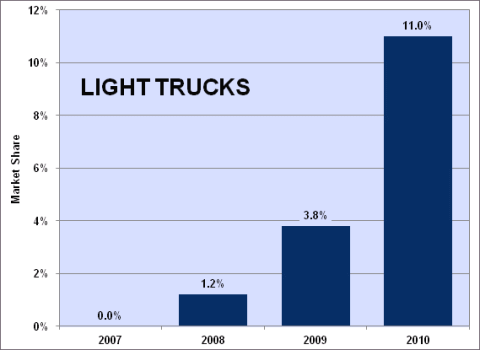 Gasoline direct fuel injection (GDI) allows fuel to be injected directly into the cylinder so the timing and shape of the fuel mist can be controlled more precisely. The improved combustion and higher compression of GDI engines makes them more efficient especially when paired with turbo charging as they usually are. The market for GDI engines has grown more rapidly for light trucks than for cars. Manufacturers began using GDI in trucks in 2008 and by 2010 GDI had grown to 11% of the market.