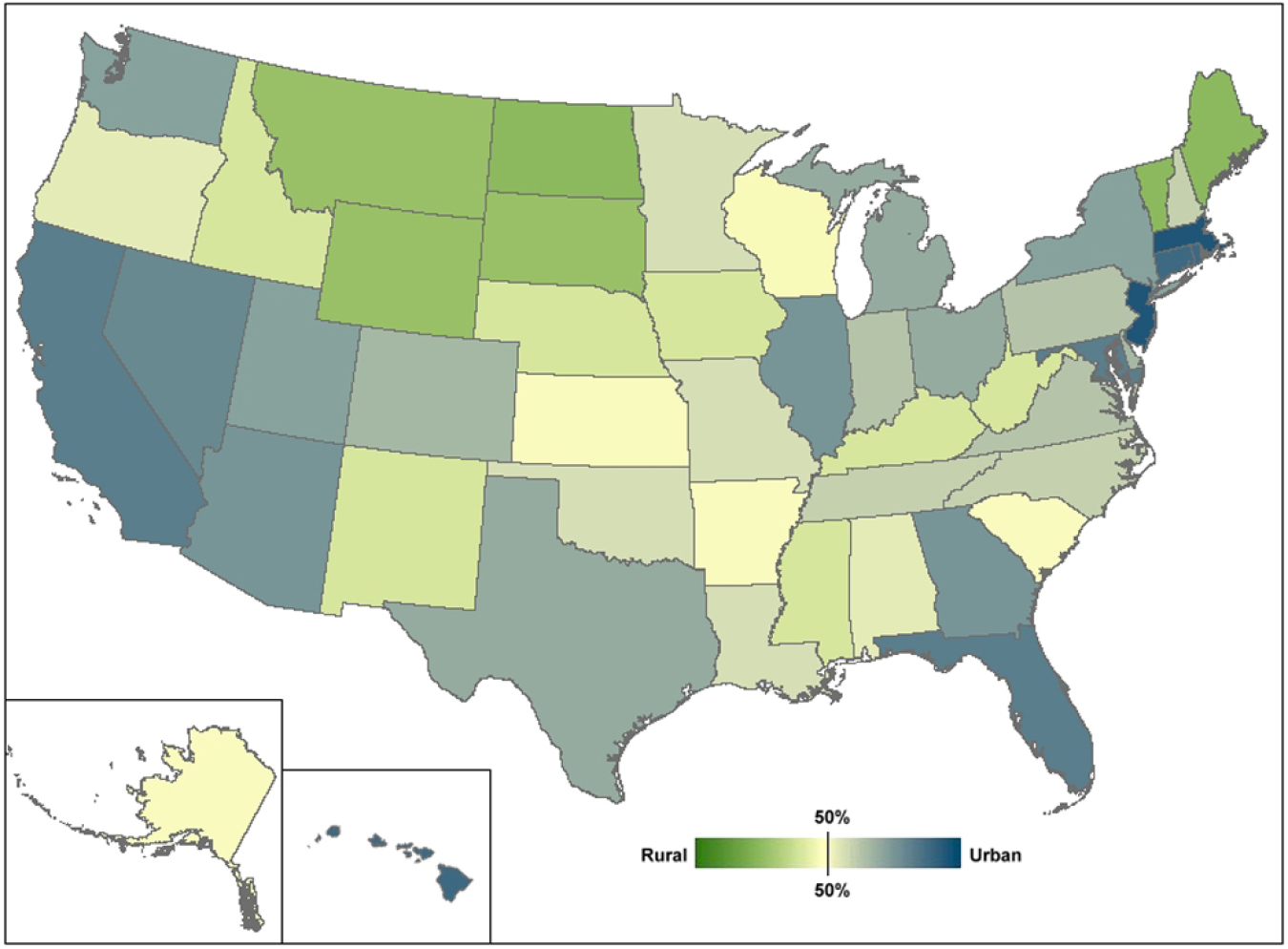 In the United States, the U.S. Department of Transportation classifies 3.9 million miles of roadway as rural and 1.2 million miles of roadway as urban. Each state has a different travel pattern affecting the proportion of vehicle miles traveled (VMT) on rural versus urban roads. Massachusetts, New Jersey, Rhode Island, Connecticut, California, Hawaii, Florida, and Maryland are states with more than 80% urban VMT shown in darker shades of blue. North Dakota has the highest percentage of rural VMT of all states (shown in green). Other states, such as Wisconsin, Arkansas, and Alaska are close to an equal number of rural versus urban VMT.