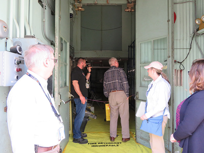 Federal Project Director Brian Henry led the tour at Y-12, where he focused on two major projects. First, participants were able to learn about the work underway to clean out and remove the old, mercury-contaminated COLEX equipment outside Alpha 4.  Next, the tour stopped at the Biology Complex, where crews have completed characterization. This process involved evaluating and sampling these 1940s-era buildings to confirm the contents and risks to enable demolition.