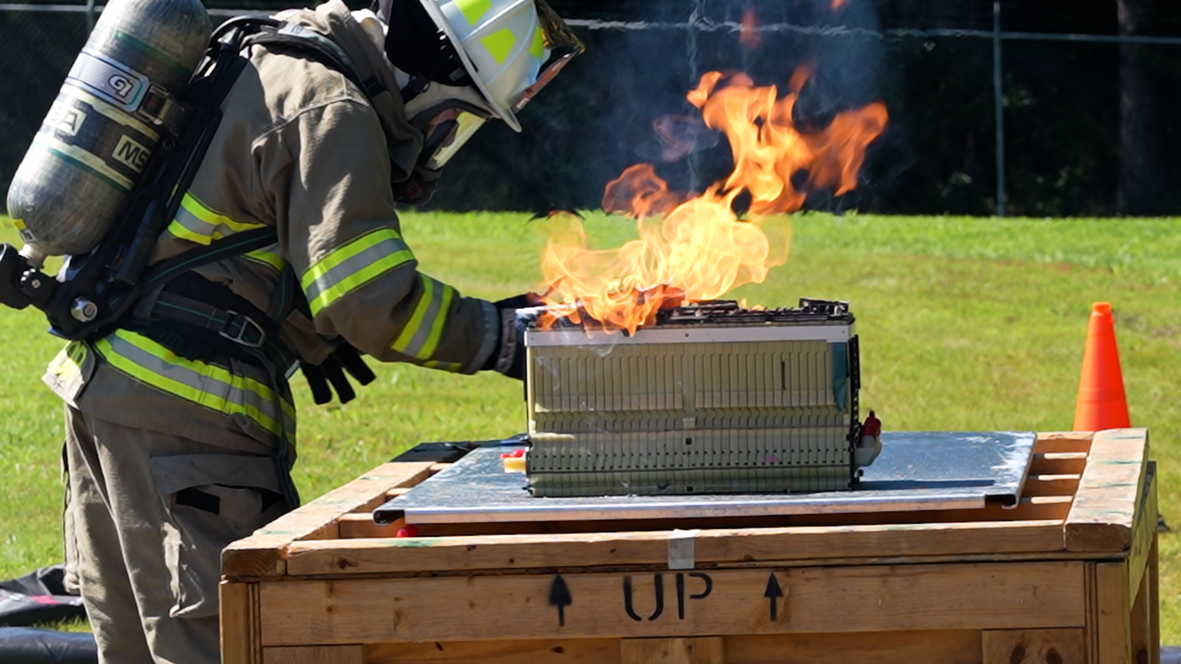 Fire protection professionals ignite an electric vehicle module as part of a demonstration. Multiple modules make up the full-size electric vehicle battery system.