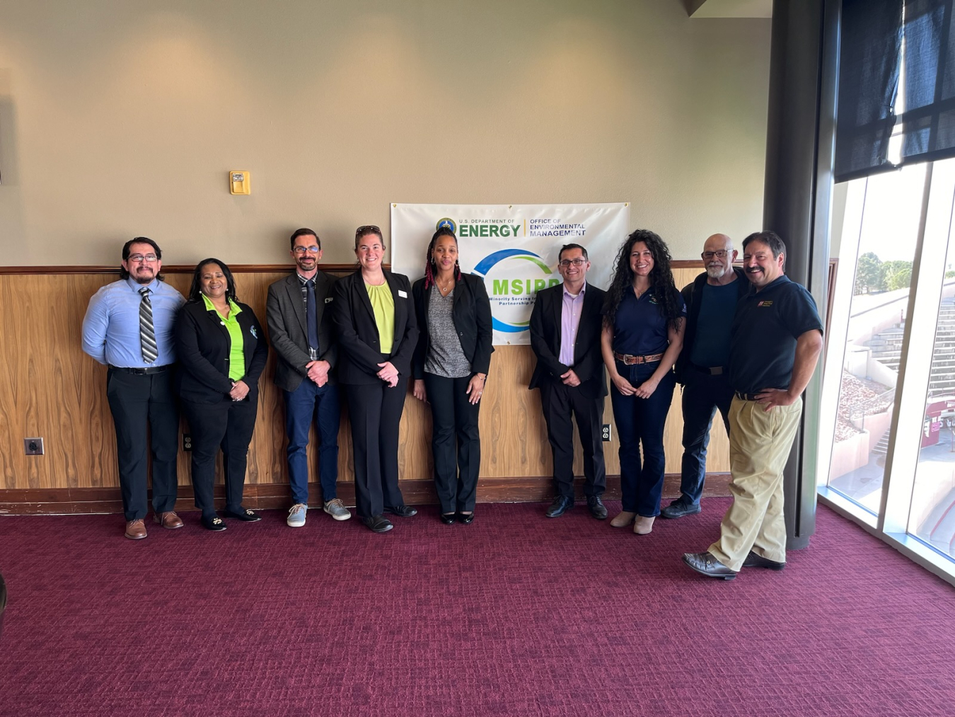 From left: Ricky Luna, University of Texas at El Paso (UTEP) Ph.D. student; Vivian Holloway, Savannah River National Laboratory Minority Serving Institutions Partnership Program (MSIPP) program manager; Skye Fortier, UTEP chemistry associate professor; Catherine Brewer, New Mexico State University (NMSU) chemical and materials engineering associate professor and project lead; Genia McKinley, EM MSIPP federal program manager; Sergio Martinez-Monteagudo, NMSU chemical and materials engineering associate professor; Regina Marquez, associate engineer at Savannah River Nuclear Solutions; Paul Andersen, NMSU chemical and materials engineering associate professor; and Frank Ramos, NMSU geological sciences professor.