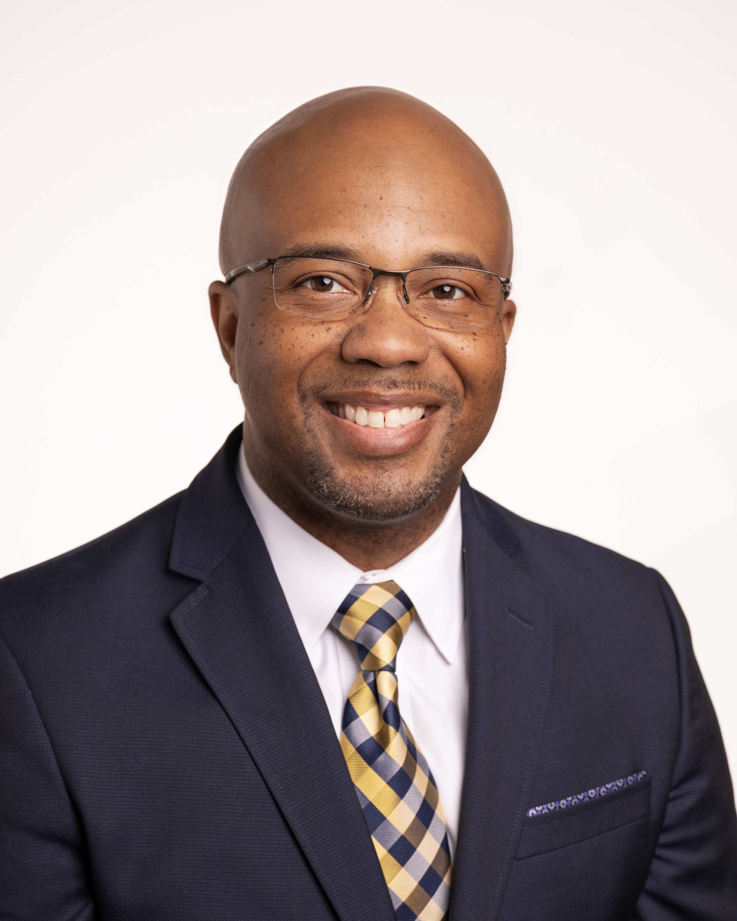 A portrait of a man in glasses and a black suit with a yellow and black tie
