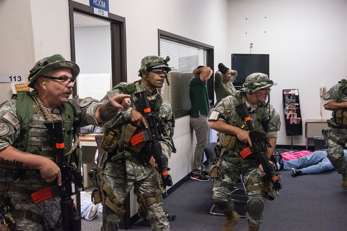 The scenario involved a disgruntled employee and her spouse entering the badge office for revenge. Mannequins were used to show 13 people killed, while 15 SRS volunteers acted as wounded employees.