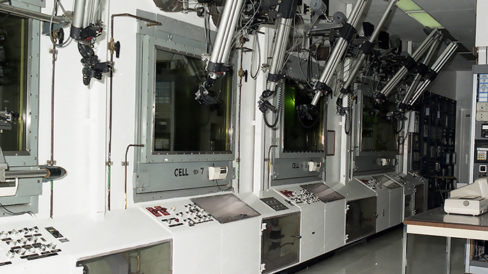 Inside the PuFF Facility are nine cells of thick concrete walls with shielded windows. Employees who worked there remained outside the cells as they handled hazardous materials with remote manipulators. Material entered the facility in Cell 1 and traveled through the other cells to be made into spheres and pellets.