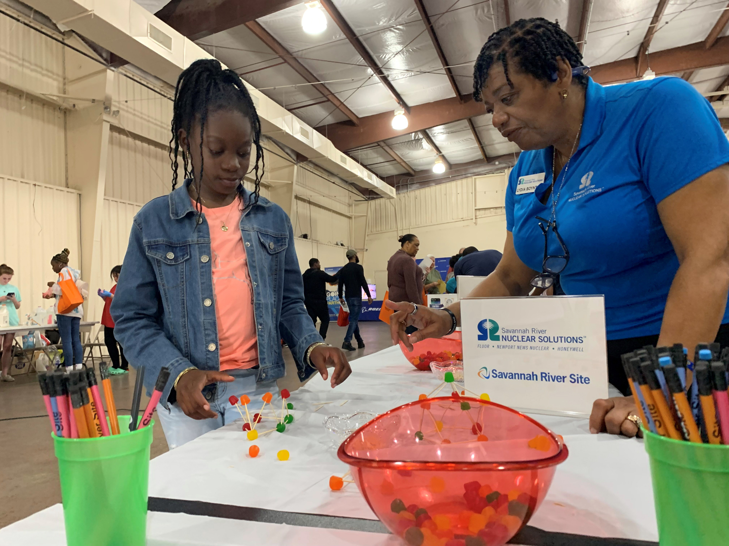 ALLENDALE, S.C. – Students from the greater Allendale, South Carolina, area recently enjoyed the inaugural “All in Allendale” event, which offered fun, food, and music, as well as science, technology, engineering and math (STEM) activities.U.S. Department of Energy Office of Environmental Management (EM) Savannah River Site contractor Savannah River Nuclear Solutions (SRNS), a major sponsor for the event, also offered a popular hands-on STEM activity pictured here. SRNS employee Lydia Boynton, right, provides advice to fourth grade student K-Jenae Cunningham, who is attempting to create a geodesic dome out of toothpicks and gumdrops. The event was developed primarily for kindergarten through 12th grade, with an emphasis on easing the intimidation students often feel when undertaking STEM subject matter, according to April Cone, dean, University of South Carolina Salkehatchie. “STEM should be fun, and there’s certainly a high demand in the workplace for this knowledge, especially at Savannah River Nuclear Solutions,” she said. “One day, these children may be working there.”