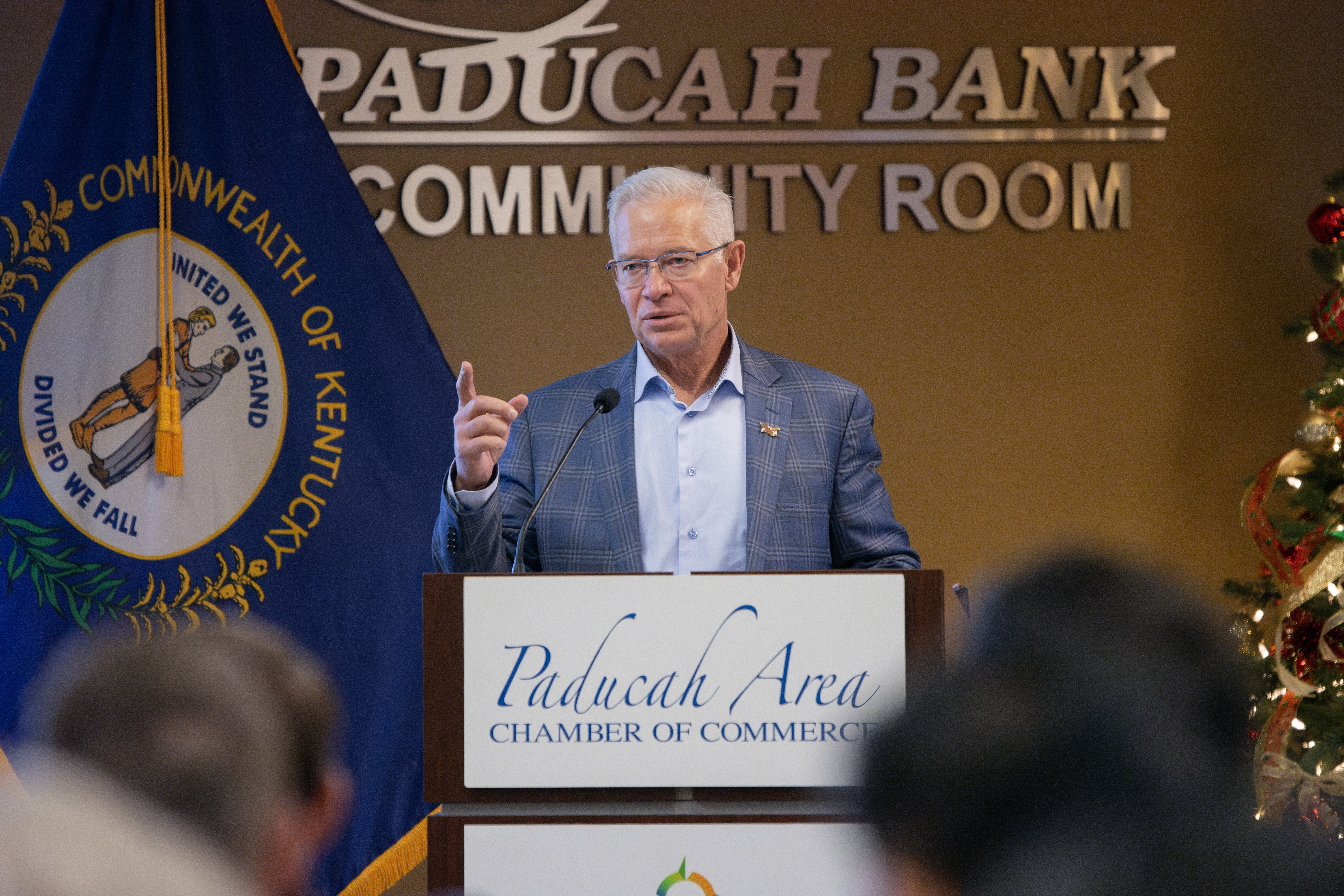 U.S. Department of Energy Office of Environmental Management Assistant Secretary Tim Walsh welcomes attendees to Industry Day at the Paducah Area Chamber of Commerce. The event offered attendees additional information about a request for offer, seeking proposals from companies to build and power artificial intelligence data centers on the Paducah Site. Event activities included presentations from subject matter experts, a site tour and a meeting with community leaders regarding economic development initiatives.