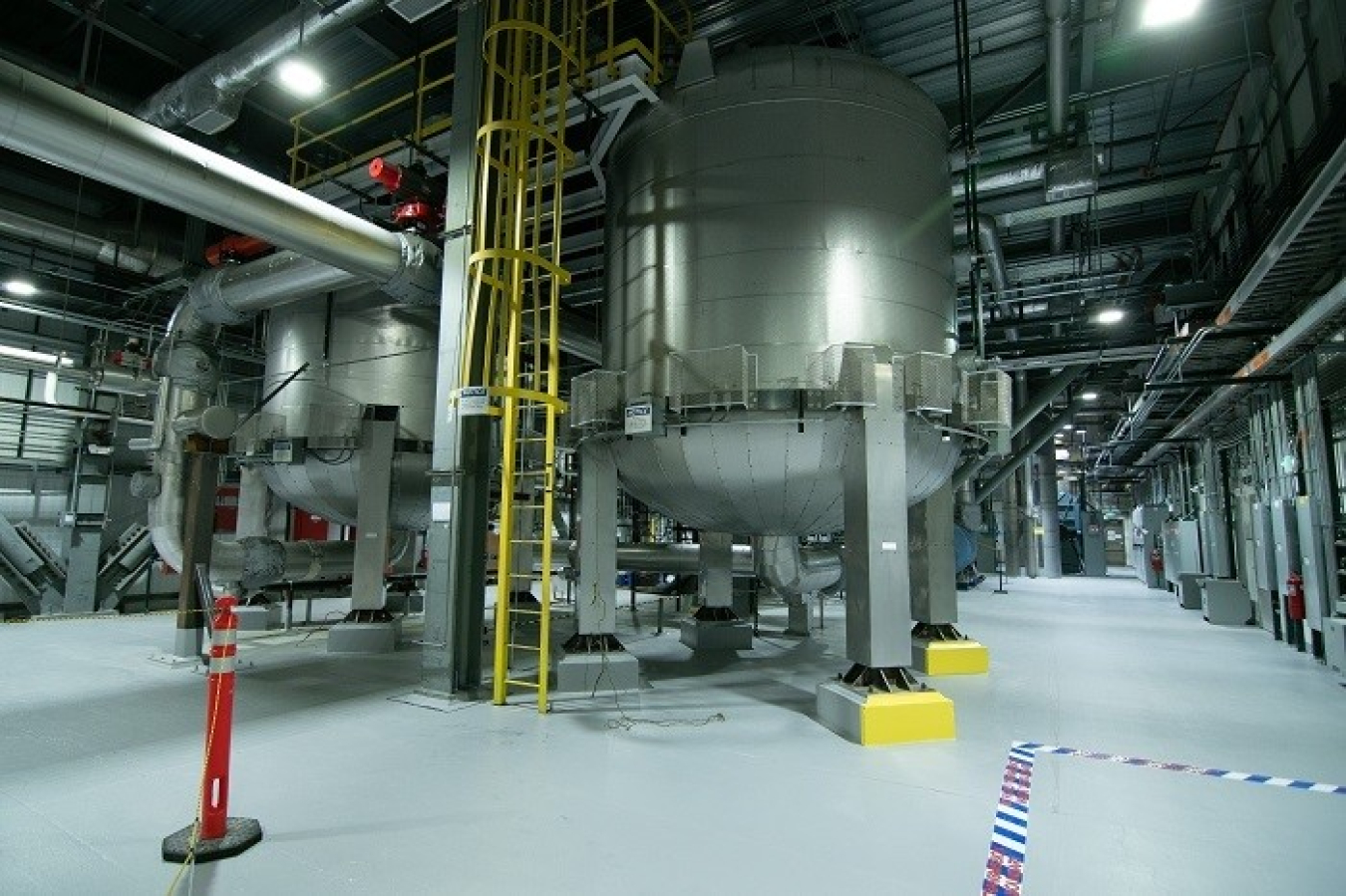 A view of two vessels that each contain approximately 30,000 pounds of granulated activated carbon. The material will be used to remove mercury from process off-gas during sodium-bearing waste treatment at the Integrated Waste Treatment Unit at the Idaho National Laboratory Site.