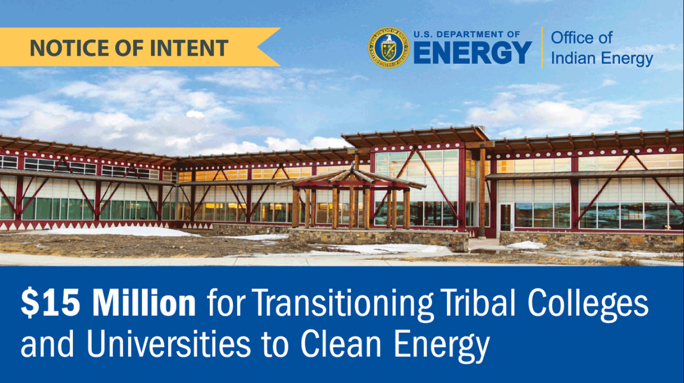 Today, the Office of Indian Energy issued a Notice of Intent to release a $15 million Funding Opportunity Announcement this spring to install clean energy technology at Tribal Colleges and Universities.
