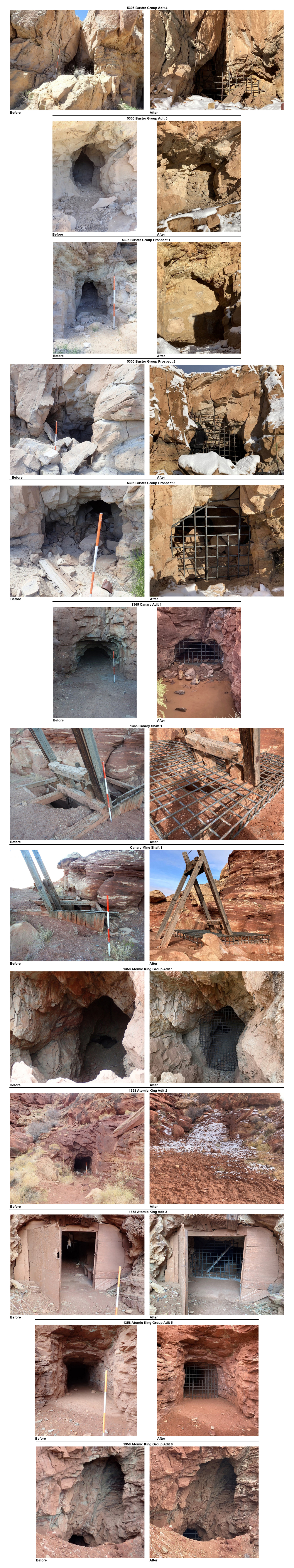 Young took photos of the work at 13 of the mines features in the Buster, Atomic King and Canary groups. The photos on the left side of the screen show the adits in their original state. The photos on the right show the same adits after DRUM teams completed their work.