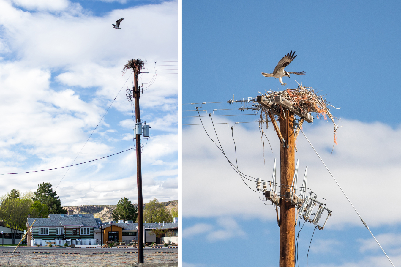 A mating pair of ospreys made a nest high above the Atomic Legacy Cabin.