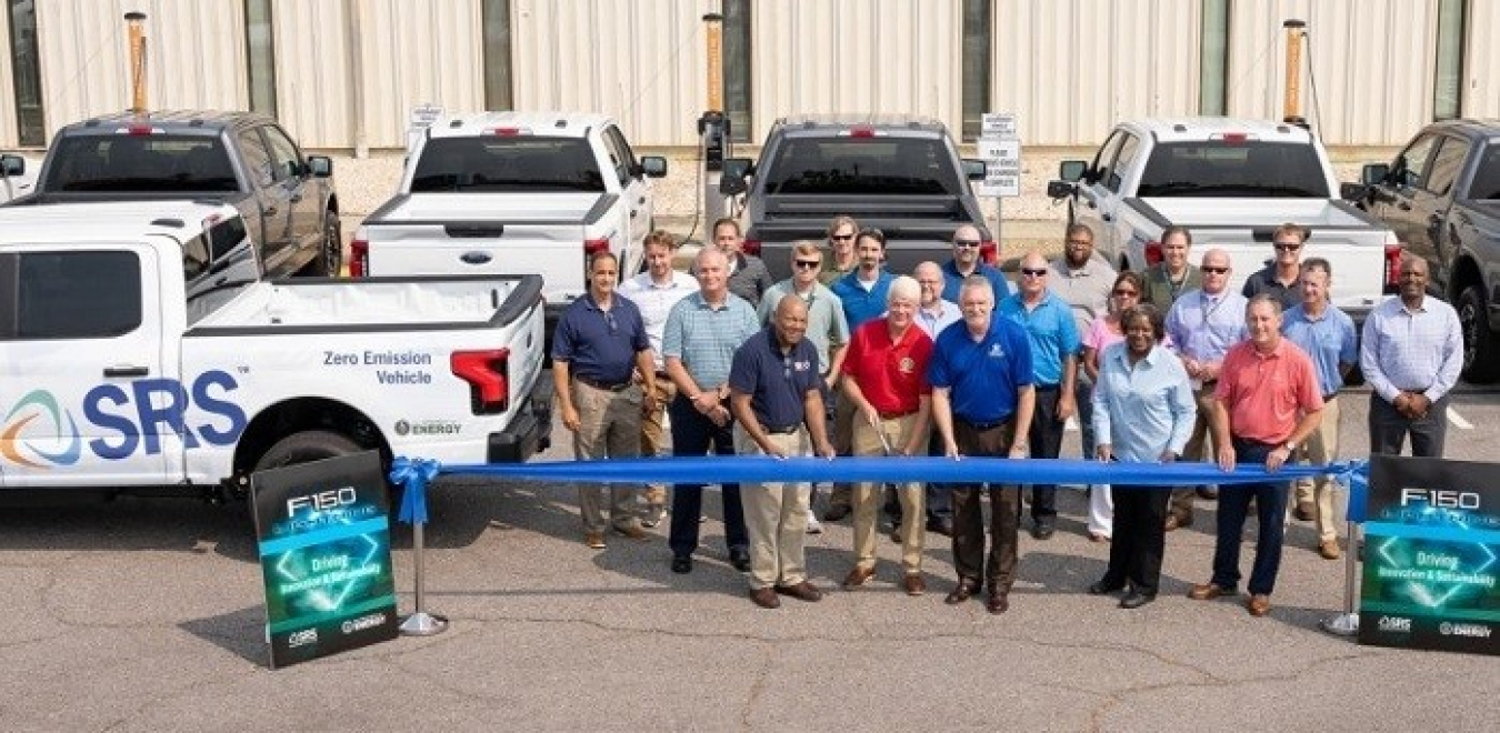 Officials cut a ribbon in a ceremony celebrating the addition of over 100 zero-emissions vehicles to the Savannah River Site vehicle fleet last year.