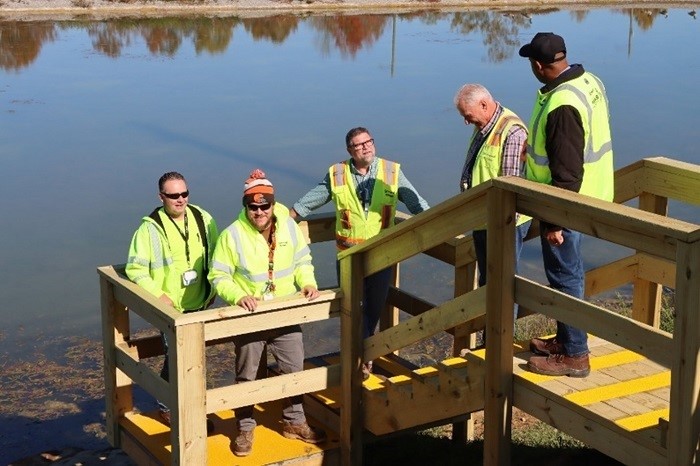 From left, environmental science technicians David Chandler and Andrew Hobstetter, Environmental Media Supervisor Stacy Claggett, Construction Manager Brian Klaiber and Environmental Science Manager Marc Hill take a close look at new steps near a sedimentation and detention pond.