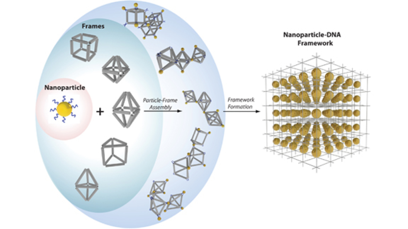 After that, researchers moved on to creating 3D frames out of the DNA. This study took what they had learned about connecting different shapes together to the next level. First, the scientists placed a nanoparticle with a few single-stranded DNA hanging off of it into each corner of a synthetic DNA frame. These strands connected the particles, bringing together the particles and frames to form three-dimensional objects. By connecting frames that had a variety of shapes – cubes, octahedrons, and tetrahedra – scientists could form different 3D architectures. This method could lead to materials industry could use for manipulating light, making chemical reactions faster, and influencing biological processes.