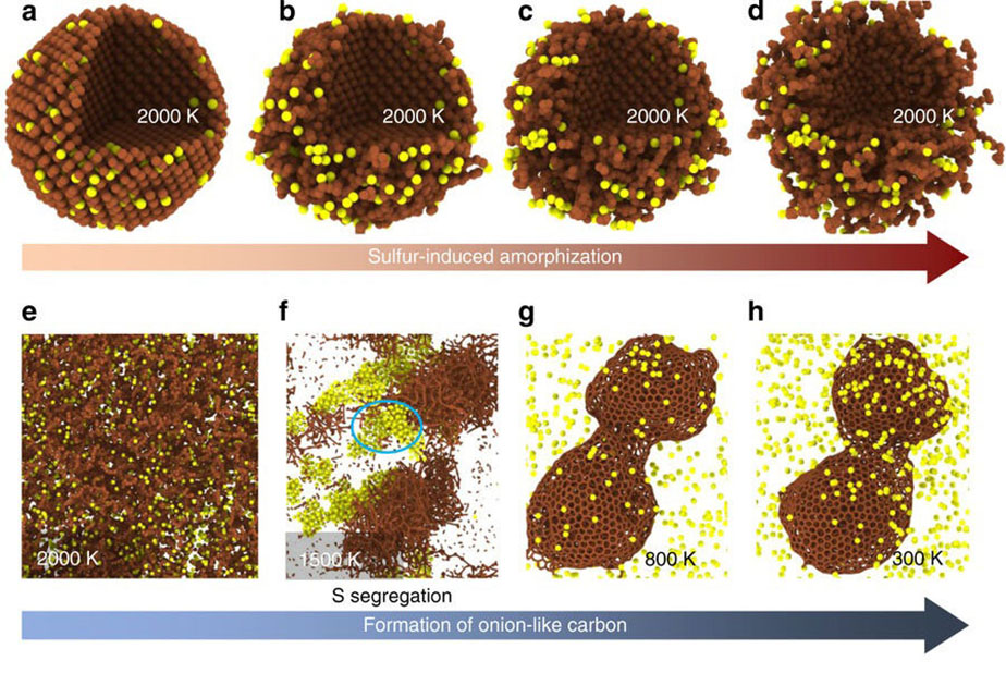 The team has continued to further develop this lubricant technology. Most recently, they replaced the graphene with molybdenum disulfide to explore the impact of using other two-dimensional materials. In addition to performing detailed experimental investigations of the new material, the researchers carried out simulations on the ALCF's Mira supercomputer to elucidate its behavior at the nanoscale. Using the LAMMPS (Large-scale Atomic/Molecular Massively Parallel Simulator) code, the team's large-scale atomistic simulations revealed molecular insights into a mechanical stress-induced tribochemical reaction that led to superlubricity. They found that the molybdenum disulfide was breaking up into molybdenum and sulfur and reacting with the nanodiamonds to convert them into onion-like carbon structures, which consist of several layers of spherical graphitic shells that can be used as a dry lubricant. The material is a self-generating lubricant that re-adjusts itself continuously, causing it to last longer than traditional dry lubricants. The team published their findings in Nature Communications.