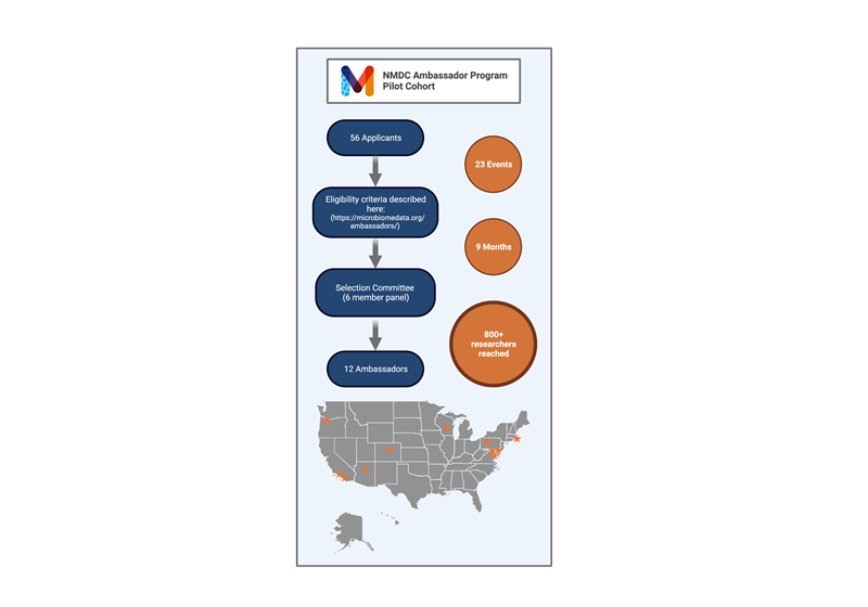 The NMDC launched the Ambassador Program to educate researchers about the benefits of metadata standards. Out of 56 applicants, the program accepted 12 early-career researchers from universities, government agencies, and research organizations. The NMDC team hosted six training sessions for the Ambassadors. These sessions included best practices in data management, data standards, and community engagement. The Ambassadors then hosted in-person and virtual events with their respective microbiome research communities. Insights from the cohort provided the NMDC team with ideas for how to improve future iterations of the program. The NMDC team recruits early-career researchers on an annual basis to join the Ambassadors Program. The 2023 cohort of the NMDC Ambassador Program has an expanded scope that focuses on multiple aspects of microbiome data stewardship, including methods for data collection, processing, and reuse. Over time, the Ambassador Program aims to promote better use and reuse of microbiome data.