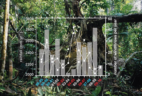 Gaps or broken trees, known as windthrows, are a common form of tree mortality in Amazonia. Windthrows affect forest dynamics and carbon storage, yet how windthrows vary over time has not been investigated. For the first time, researchers measured the seasonal and interannual variability of windthrows, focusing on an area in central Amazonia (Brazil). The team used Landsat images from 1998 through 2010 to detect windthrows, based on their shape and spectral characteristics. They found that windthrows occur every year but were more frequent between September and February. The team found that complex, organized downward rain and thunderstorms embedded in larger systems, such as squall lines, can cause windthrows. Also, they found that southerly squall lines (that move from southwest to northeast) happened more often than previously stated at the ~50-year interval. Looking across years, the team did not find a link between the El Niño-Southern Oscillation and windthrows.