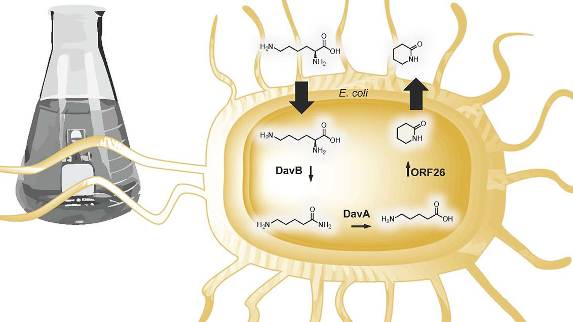 Millions of tons of nylon is produced annually requiring harsh conditions. Manufacturing nylon involves making five- and six-member ring compound precursors, called lactams. Biological production of these highly valued precursors will reduce the need for petroleum and avoid toxic harsh conditions. However, biological production has been limited due to a lack of enzymes that carry out crucial steps at room temperature and pressure. The U.S. Department of Energy Joint BioEnergy Institute researchers demonstrated production of the lactam precursors using an enzyme—acyl-CoA ligase—from Streptomyces aizunensis. The enzyme has a broad substrate spectrum and can turn linear amino acids into their corresponding cyclic lactams when the reaction occurs in Escherichia coli. Further metabolic engineering of the pathway leads to production of the lactams directly from the common amino acid lysine. The research offers insights into manufacturing nylon, a vital material, without energy-intensive heat and harsh chemicals.