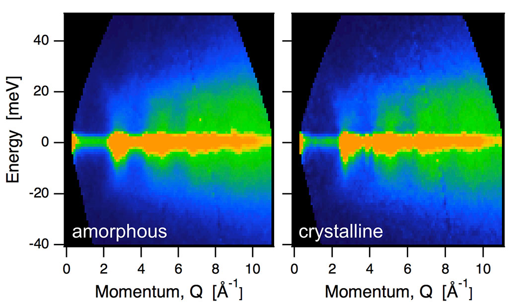 A team from Caltech heated a copper zirconium glass in situ in an advanced spectrometer at the SNS. From the inelastic neutron scattering data of the glass at different temperatures through its glass transition, the vibrational spectra as a function of temperature were extracted. Interestingly, the vibrational spectra showed very little change, largely eliminating vibrational entropy as the source of excess entropy at the glass transition. The excess heat goes almost entirely into rearranging the atoms, thus changing only the configurational entropy. This research answered a decades-old question about the entropy of the glass transition. The revised atomistic viewpoint may be pertinent to the melting of crystalline materials too. The demonstration of rapid inelastic neutron scattering measurements with modern instruments paves the way for the exploration of dynamics of near phase transitions in a wide range of materials.