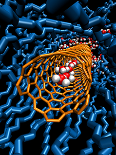 Proton transport is important in biology and energy technology. Rapid proton transport is achieved through protons hopping along water molecules similar to a bucket brigade passing a pail of water down the line. Ten years ago, simulations predicted that water confinement in hydrophobic ("water-fearing") carbon straws could achieve faster proton hopping, but demonstrating this efficient proton transport in artificial systems has been very challenging. Scientists at Lawrence Livermore National Laboratory and the University of California-Merced have now prepared short carbon nanotubes with two different diameters embedded in synthetic lipid membranes that mimic biological ion channels. When the diameter was greater than 1 nanometer, water was not confined to one dimension and, in this case, proton transport rates were comparable to bulk water. However, when much narrower (0.8-nanometer-diameter) tubes were used, the confined water formed one-dimensional water wires that drastically boosted the proton transport rate. To prepare the narrow tubes, single-walled carbon nanotubes were sonicated to cut and purify them. The smaller diameter nanotubes readily incorporated into a lipid membrane and formed passageways across the membrane—roughly 17 nanotubes per 200-nanometer liposome (a spherical vesicle encapsulating water with a lipid bilayer). Changes in the intensity of a fluorescent dye trapped in the lipid vesicle membrane were used to monitor proton transport that was initiated by rapid acidification (increasing the proton concentration) of the solution surrounding the liposome. The proton transport in the water "wires" inside narrow carbon nanotubes was an order of magnitude faster than bulk water and faster than the state-of-the-art membrane in fuel cells.