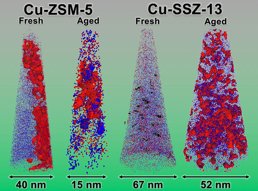 Decreasing fuel consumption and emissions in diesel vehicles requires end-of-tailpipe technologies. To reduce emissions of nitrogen oxide pollutants that cause the formation of acid rain and smog, the most effective strategy is ammonia selective catalytic reduction using urea as the source of the ammonia reductant with the reaction occurring over a copper-exchanged zeolite catalyst. Such a catalyst is Cu-ZSM-5, which was originally described in 1986, but could not be fully commercialized as it deactivates well before the end of vehicle life. A major breakthrough in zeolite technology occurred in the mid-2000s when another copper-exchanged zeolite catalyst, Cu-SSZ-13, was discovered with unsurpassed activity and stability (that is,it cleans exhaust better over a longer period of time), and commercialization commenced quickly in 2010. Significant gaps remain in understanding the deactivation of zeolite catalysts, and thus, researchers at Utrecht University and Oak Ridge National Laboratory used APT to peer inside industry-relevant zeolites to visualize their nanoscale, elemental structure in 3-D. They looked at both Cu-ZSM-5 and Cu-SSZ-13 catalysts in fresh (that is, not exposed to diesel engine exhaust) and aged (simulated exposure to 135,000 miles of diesel exhaust) conditions. The study showed the nanoscale formation of a culprit phase causing catalytic deactivation (CuAl2O4l) through copper-aluminum aggregation, which was severe in Cu-ZSM-5. In contrast, Cu-SSZ-13 did not exhibit severe copper-aluminum aggregation nor evidence of the deactivating CuAl2O4 phase and was still able to optimally clean combustion products.