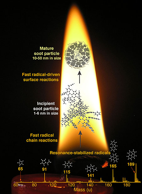 The chemical reactions behind soot particle formation have long been a mystery. The reactions, which turn gaseous hydrocarbons into a solid that resembles graphite, were difficult to measure and model. Why? The reactions occur extremely quickly inside a flame; most measurement techniques perturb the conditions under which the chemistry proceeds, and the complexity of the problem makes modeling and theoretical approaches difficult or intractable. Now, scientists have obtained detailed measurements from flames produced by burning different fuels under various conditions. Their work revealed sequences of resonance-stabilized radicals. The radicals quickly react with various hydrocarbons to form stable molecular complexes and generate more radicals, perpetuating the chain reaction. The result? The radical-based chain reaction leads to covalently bound clusters of hydrocarbons that would otherwise be too small to condense at high temperatures. One of the main breakthroughs of this work is the realization that soot inception is not a typical particle-nucleation process. Instead of a thermodynamically driven condensation process, soot inception occurs through rapid formation of strong chemical bonds (covalent bonds). This discovery provides a fundamentally new insight into the physics of the high-temperature inception of small carbonaceous particles.