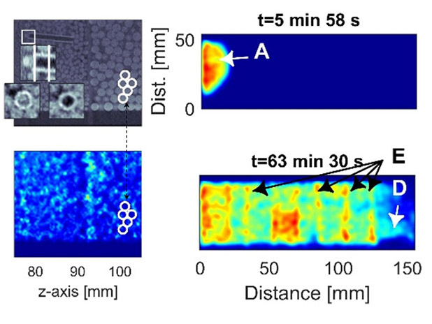 Existing techniques for understanding radionuclide transport in the environment do not fully capture the 3-D complexity of transport in soil and waste forms. To understand the influence of coupled processes on transport in the environment, a team led by researchers from Clemson University combined medical imaging techniques to monitor dynamic radionuclide experiments in mixtures of soil and glass beads. They used soil and glass beads as a model to investigate the viability of these imaging techniques for studying the potential environmental transport if waste forms failed or were breached. They combined commonly used SPECT (single-photon emission computed tomography) with well-established X-ray computer tomography (CT). The time-lapsed SPECT images illustrated both local and global non-uniform transport phenomena, and the high-resolution CT data allowed for correlations of non-uniformity with structural features within the materials, such as macropores. This combined data can be efficiently used to detect fractures, macropores, and permeability variations as well as non-uniform flow paths. Direct imaging of concentration changes during transport can allow for testing and refinement of models describing how radionuclides interact with geologic and human-made materials. These insights could further our fundamental understanding of biogeochemical processes in porous media, which is important in large-scale environmental risk analyses.