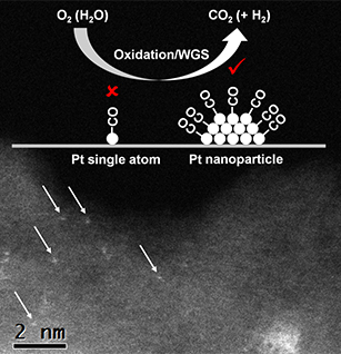 Catalysis routinely allows an amazingly large number of chemical reactions to proceed under conditions where such reactions would ordinarily be impossible. As such an important aspect of the energy frontier, improving our understanding of catalysis remains paramount to advancing our nation's energy future. However, even with such high usage and importance, many catalytic reaction mechanisms remain highly debated or completely shrouded in mystery. One significant debate revolves around the active site structures of platinum and gold: does the active site structure consist of single atoms or small nanoparticles? To answer this question, researchers from Northwestern University, University of California at Santa Barbara, and Argonne National Lab utilized carbon monoxide as a probe molecule while applying advanced infrared (IR) spectroscopy experimental methods. To begin, they distributed an assortment of single platinum atoms and small platinum nanoparticles, "visible" with ultrahigh-resolution transmission electron microscopy, onto a non-reactive support material in various ratios and then exposed the surfaces to carbon monoxide. Due to the energy difference in carbon monoxide binding to a single metal atom versus a small nanoparticle, the scientists detected distinct IR signals for each carbon monoxide bond. Then, they introduced oxygen or water (O2 or H2O) to simulate carbon monoxide oxidation and water-gas shift reactions, respectively, to potentially react with the carbon monoxide bound to the platinum atoms and/or particles. They monitored the extent of the reaction using the IR signals for the various catalytic structures, which provided conclusive results. Only the carbon monoxide molecules adsorbed onto the small platinum nanoparticles reacted with O2 or H2O at low temperatures, showing that the active sites in carbon monoxide oxidation and water-gas shift reactions are associated with the nanoparticles, but not the single atoms. This finding is important not only for platinum and for the carbon monoxide oxidation and water-gas shift reactions, but it can also be applied towards understanding the mechanisms of other noble-metal catalyzed reactions. The knowledge gained from this study could also enable the design of more active and selective catalysts.