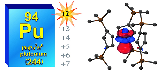 Associated with nuclear power and national security, plutonium (Pu) has some of the most complicated chemistry on the periodic table. For the first time, scientists showed a new oxidation state (electron arrangement) for element 94. They achieved this result by adding electrons to a specific plutonium-containing molecule, an organometallic Pu3+-containing complex. They then studied the results. The results included a complex containing Pu2+. The Pu2+ was bound to carbon in the complex. This is the first example of plutonium (Pu2+) bonding to carbon in the literature.