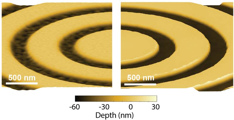 The electron source developed in this study is a gold surface with concentric circular grooves arranged in a bullseye pattern. When a laser hits the gold, the laser transfers energy to surface plasmons—electrons on the surface of the gold that move collectively. The bullseye’s grooves cause the plasmons to ripple inward and outward like waves bouncing off the sides of a pot of water. When the waves simultaneously hit the center of the bullseye, a small but intense beam of electrons fires out from the center. The response time of the source is less than 10 femtoseconds (the time it takes for light to travel 3 micrometers), and its size is approximately 100 nanometers (approximately the width of a cell membrane). For the emitted beam to be as bright as possible, the surface must be extremely flat. The researchers made an atomically flat surface using a new nanofabrication technique developed at the Molecular Foundry to enhance the beam brightness. The possibility of an ultrafast, tiny electron beam opens the doors for understanding chemical reactions and structural changes at molecular-length scales, particularly for materials such as nanoparticles that do not look the same over a large area or for interfaces between different materials.