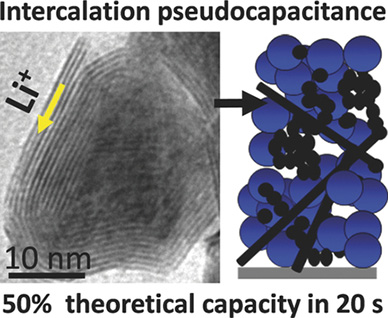 New battery electrodes based on nanostructured molybdenum disulfide combine the ability to charge in seconds with high capacity and long cycle life. Typical lithium-ion batteries charge slowly due to slow diffusion of lithium ions within the solid electrode. Another type of energy storage device (a.k.a., pseudocapacitors), which has similarities to the capacitors found in common electrical circuits, speeds up the charging process by using reactions at or near the electrode surface, thus avoiding slow solid-state diffusion pathways. Nanostructured electrodes allow the creation of large surface areas so that the battery can work more like a pseudocapacitor. In this work at the University of California, Los Angeles, scientists made nanostructured electrodes from a molybdenum disulfide-carbon composite. Many electrodes are based on metal oxides, but because sulfur more weakly interacts with lithium than oxygen, lithium atoms can move more freely in the metal sulfide than the metal oxide. The result is a battery electrode that shows high capacity and very fast charging times. The novel electrodes deliver specific capacities of 90 mAh/g (about half that of a typical lithium-ion battery cathode) charging in less than 20 seconds, and retain over 80 percent of their original capacity after 3,000 charge/discharge cycles. Capacities of greater than 180 mAh/g (similar to cathodes in conventional lithium-ion cells) are achieved at slower charging rates. The results have exciting implications for the development of fast-charging energy storage systems that could replace traditional lithium-ion batteries.