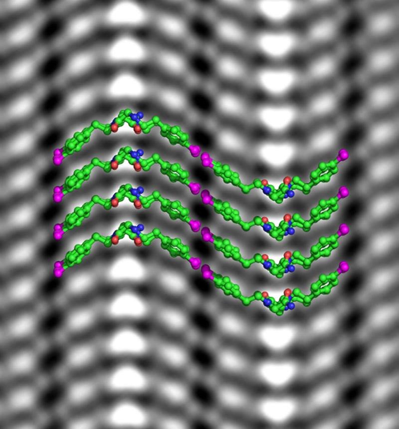 For the first time, scientists revealed the atomic structural details of a synthetic soft material. Peptoid diblock copolymers consists of two different protein-like chains that are bonded together. These materials were designed to fit tightly with one another to form highly organized crystalline sheets in water. Individual molecules and their relative orientations within the nanosheets were directly observed by cryogenic transmission electron microscopy (cryo-TEM), revealing atomic details in position space inaccessible by conventional scattering techniques. The ultracold temperature used to flash-freeze the nanosheets effectively locked the molecules in place. Imaging the sample under cryogenic conditions helped prevent the energetic electrons from destroying the structure. To further protect the soft materials from the electron beam, the researchers used fewer electrons per image. Images obtained under these conditions were processed using sophisticated mathematical tools and machine learning algorithms to produce high-resolution pictures of the atomic scale structure.