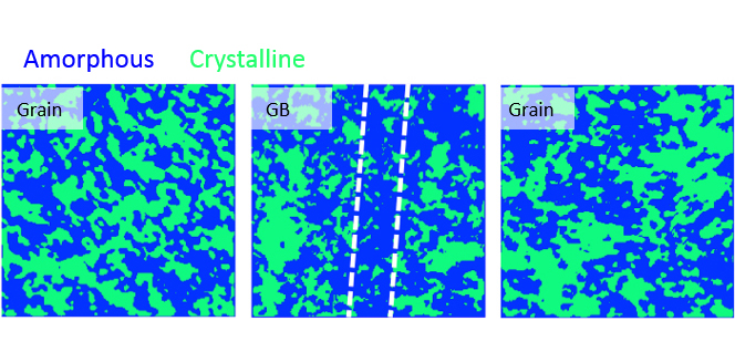 One way to optimize a material's resistance to damage due to bombardment with energetic particles (such as those in nuclear energy environments) is to control the size and distribution of the crystalline regions in the atomic structure, called grains. These crystalline regions are responsible for the mechanical strength and stability needed to withstand radiation exposure in nuclear reactors. The colorized transmission electron microscope images show regions within the grains where the material has lost crystallinity (colored in blue); importantly, these regions of lost crystallinity are concentrated near the boundaries between grains with different orientations (GB), which could significantly impact performance of the material.