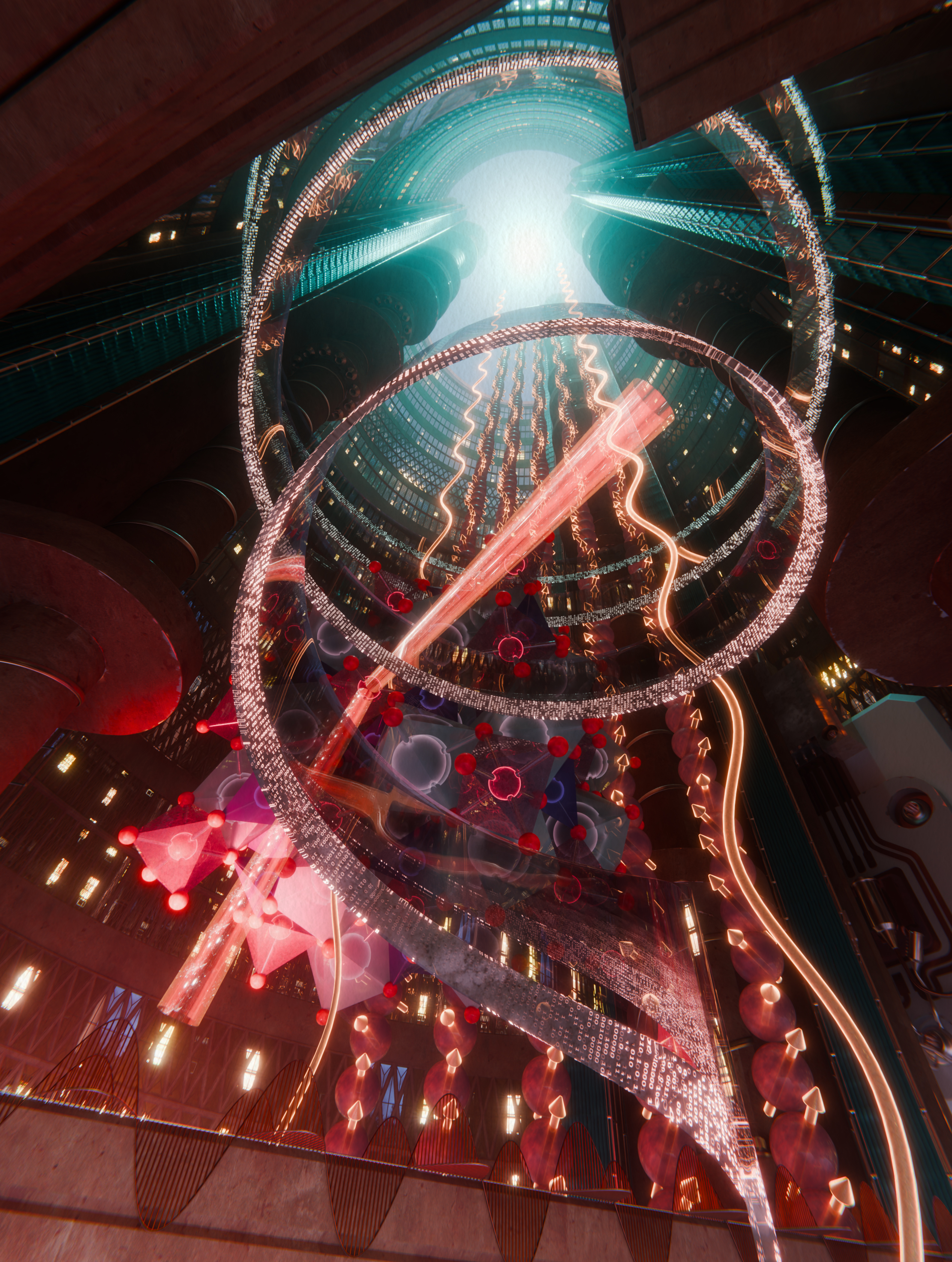 This is a representation of the spin-wave current detected by X-rays. A temperature gradient (blue and red) generates a spin wave current (orange arrows and wave traces) in the yttrium iron garnet sample. X-ray beams hit the sample and scatter back.