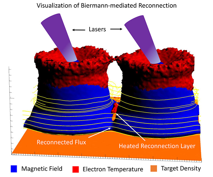 The experiments and numerical simulations provide a new platform for replicating in the laboratory the magnetic reconnection observed in astrophysical plasmas. Researchers discovered a new mechanism, named the Biermann battery-mediated reconnection, using these processes. Findings indicate that 3-D variations in the electron density and temperature inside the current sheet generate extra currents, and this enhances the rate of the reconnection and the conversion of magnetic energy into kinetic energy. The results could help to better understand reconnection in space plasmas, as in the Earth's magnetosheath, and could provide insight into the plasma and magnetic field dynamics in high-energy-density plasmas.