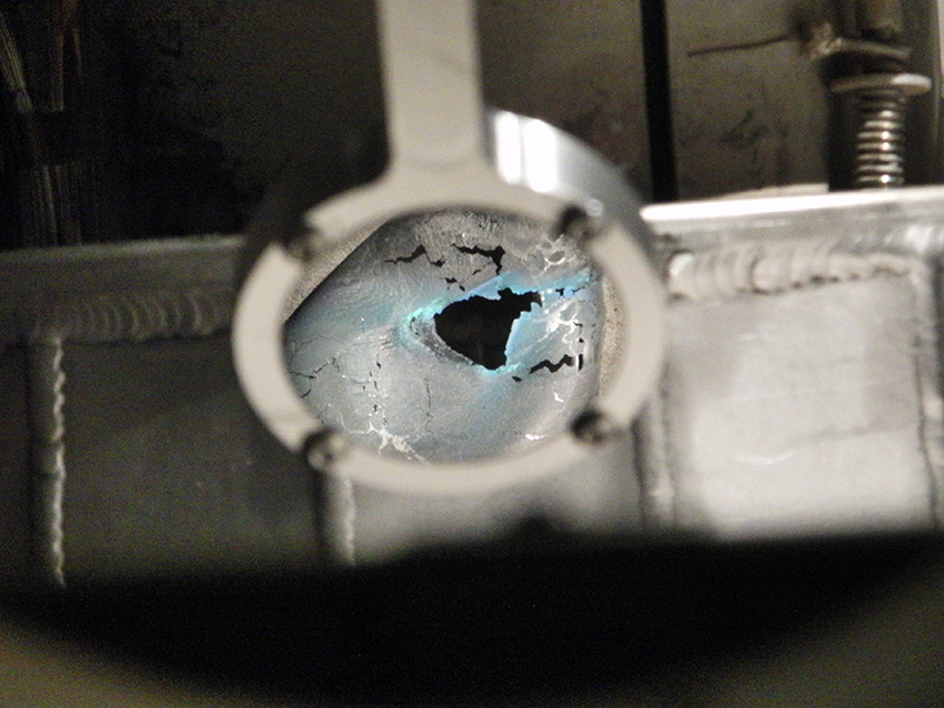 View of the surface of a lithium pool in Lithium Tokamak Experiment, as it is heated and cleaned of oxides by a beam of high energy electrons. Electron impact causes the oxide layer to fluoresce a pale blue glow. Lithium is evaporated from two pools such as this, to coat the entire inner surface of the tokamak.