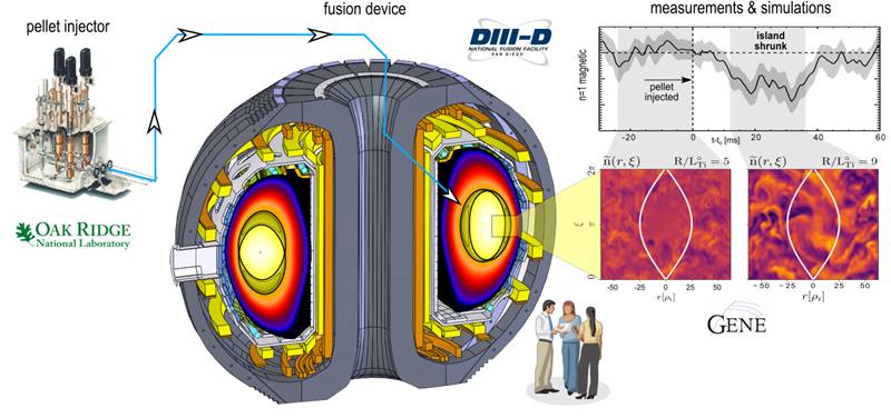 Fusion tokamaks operate by confining a plasma within powerful magnetic fields long enough that it can be heated to the extreme temperatures where fusion reactions can occur. Instabilities in the magnetic fields can allow energy to escape, stopping the reaction. One such instability is a phenomenon known as a magnetic island, which is a structure that tears holes in the magnetic field. In some cases, islands can be eliminated by driving a localized current inside them with microwave beams, but this requires a significant amount of energy. Researchers at DIII-D observed that firing frozen pellets of deuterium deep into the plasma caused magnetic islands to shrink. Computer simulations determined that the shrinkage was likely caused by increased turbulence in the plasma due to the injected pellets. The shrunken islands can then be completely eliminated with 70% less microwave power than what is normally required. Saving these resources could improve the net electricity output of a reactor. Thus, the approach may offer substantial benefits for future fusion reactors.