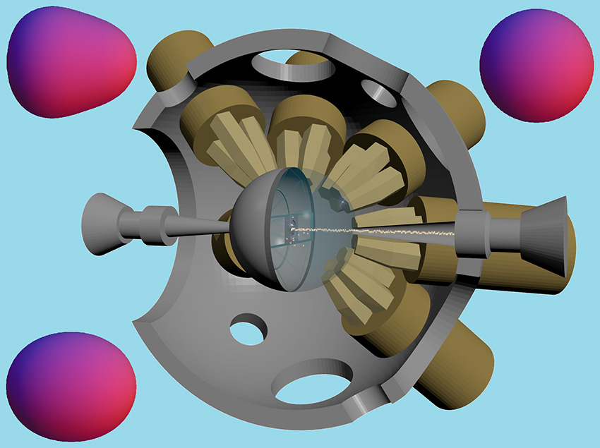A depiction of the experimental apparatus used to distinguish the pear shape (upper left) present in some barium nuclei from the more common spherical (upper right) or ellipsoidal (lower left) shapes characteristic of most nuclei.