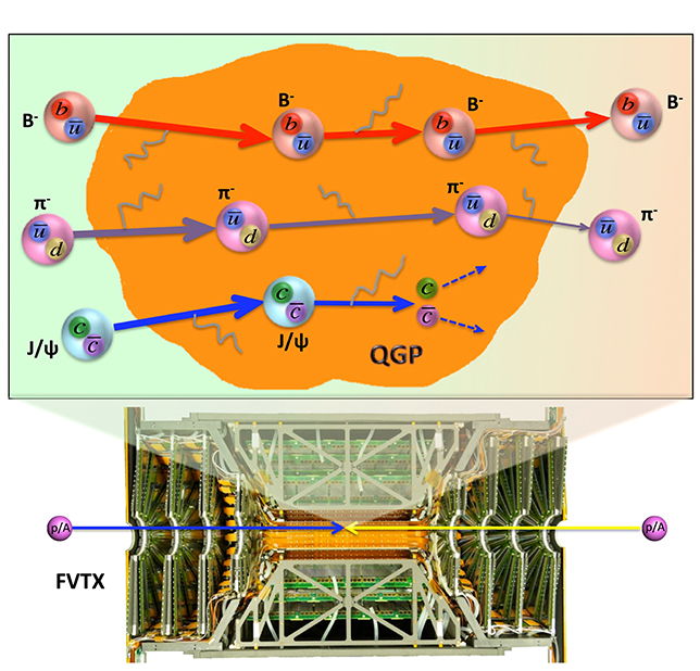 Quarks are the fundamental building blocks of matter and have family members with different masses. The up and down quarks, which make up neutrons and protons, are the lightest quarks. The charm quark is about 600 times heavier than the up quark, and the bottom quark is around 2000 times heavier than the up quark. Particles containing these charm and bottom quarks have been used by nuclear physicists to probe a super hot (several trillion Kelvin) and dense matter state known as the quark-gluon plasma. In the plasma, D hadrons (formed by a charm quark and a light quark) and B hadrons (formed by a bottom quark and a light quark) travel a fraction of a millimeter before decaying into other particles. The FVTX detectors in the PHENIX (Pioneering High Energy Nuclear Interaction eXperiment) at the Relativistic Heavy Ion Collider (RHIC) can precisely measure the minimum distance between particle trajectories and the collision point, which is proportional to the particle's flight path. Measuring the trajectories allows the identification of D and B hadrons among the thousands of particles produced in high-energy nucleus-nucleus collisions. D and B hadrons are produced before the quark-gluon plasma is formed and can serve as a hard probe to study the quark-gluon plasma microscopic structure. The first measurements with the FVTX indicate that no matter how dense the medium is in copper+gold collisions, the number of B hadrons is preserved. However, J/y and y' particles are broken up in the nuclear medium. These measurements are a first step in precisely determining how much energy heavy quarks lose in the quark-gluon plasma medium along their path lengths. The research team expects particles that contain a heavier bottom quark (B hadrons) will be modified less by the nuclear medium compared to particles that contain the lighter charm quark (D hadrons). A more detailed study of the heavy quark, mass-dependent energy loss in the quark-gluon plasma medium, in heavy ion copper+gold and gold+gold collisions, is underway.