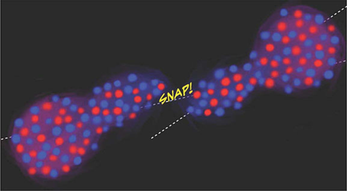 Gases are easy to compress, not so liquids and solids. How much the volume of something changes under pressure, and how much it heats up when compressed, are described by its equation of state. Nuclei can also be compressed. The nuclear equation of state describes how hard it is to squeeze a nucleus, how hot it gets when you squeeze it, and how both of these change when more neutrons are added to the nucleus. Large numbers of excess neutrons can be added to nuclei in certain types of stellar explosions or in the extreme environment of a neutron star. Understanding how the resulting neutron-rich matter behaves is an active area of investigation. Researchers at the Texas A&M University Cyclotron Institute used a new technique, equilibration chronometry, to monitor the transfer of excess neutrons over time. The transfer happens in less than a zeptosecond (10-21 second). Scientists took a series of "snapshots" that show the neutrons flowing from a small region of high concentration and expanding into a larger area of lower concentration.